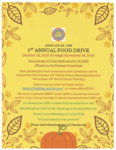 IBEW Local 1289 will be holding it’s Inaugural Food Drive from October 15- November 18. Donations of non-perishable food and money will be collected at the October 15th North Union Meeting and November 18th South Union Meeting.